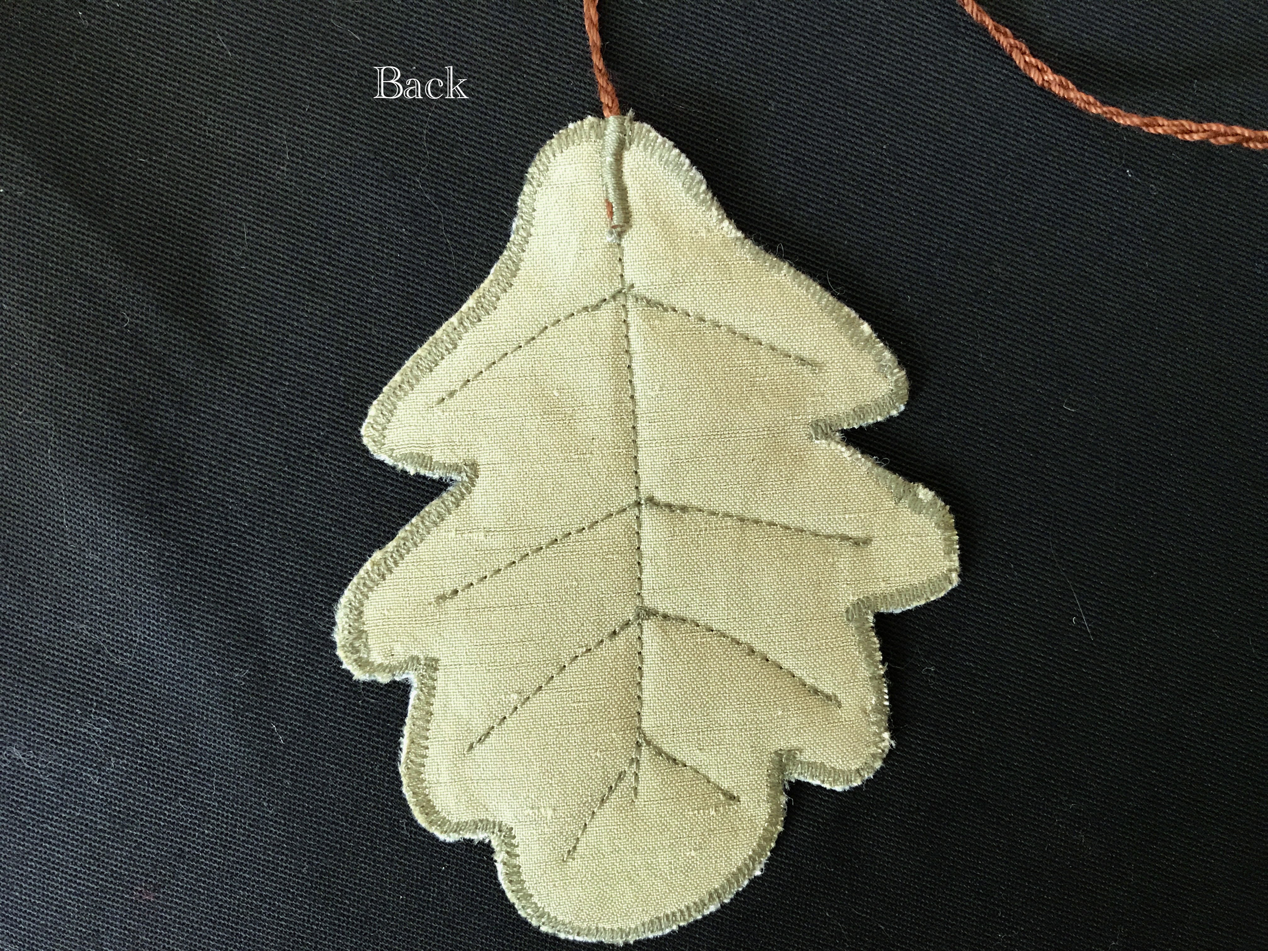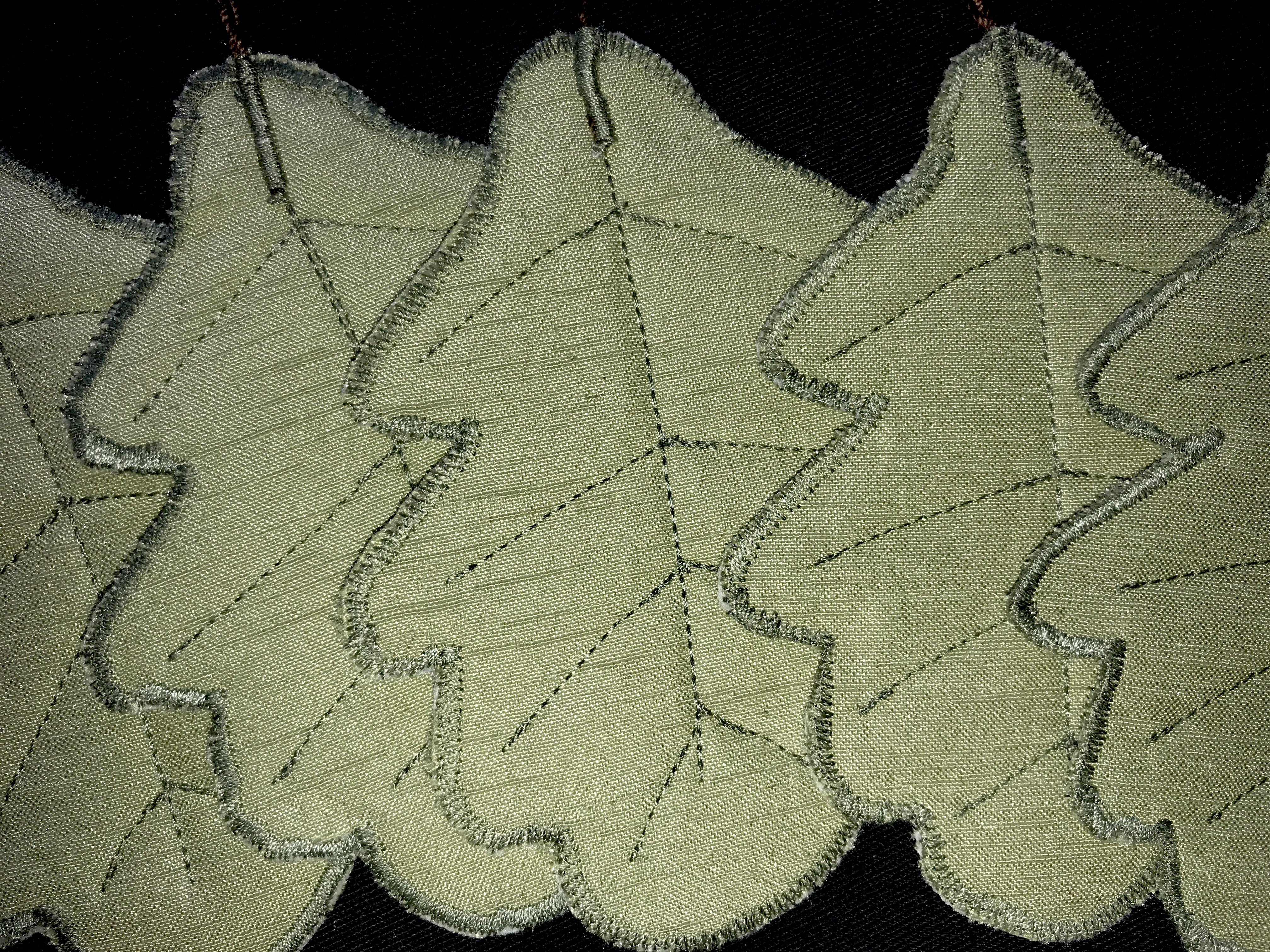 The light green dupione fabric of the oak leaves has a lovely texture and subtle shine. Each leaf has been interfaced – making it fairly rigid whilst still being pliable.