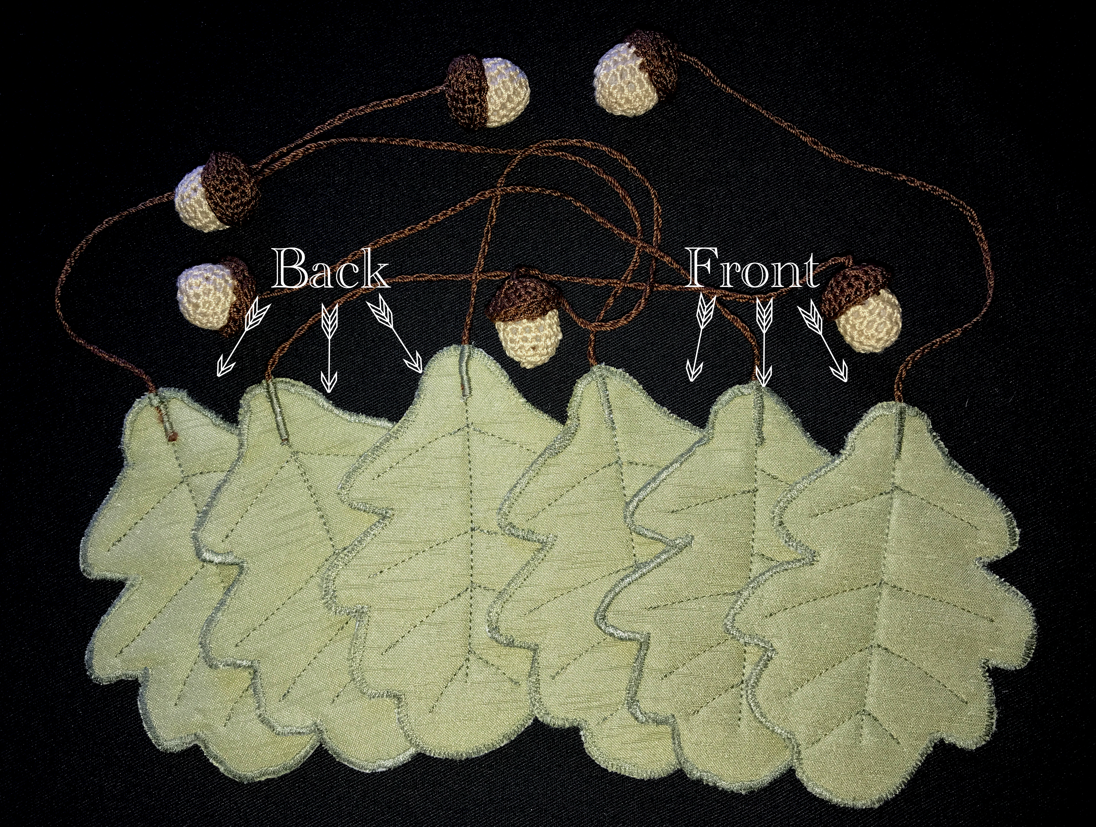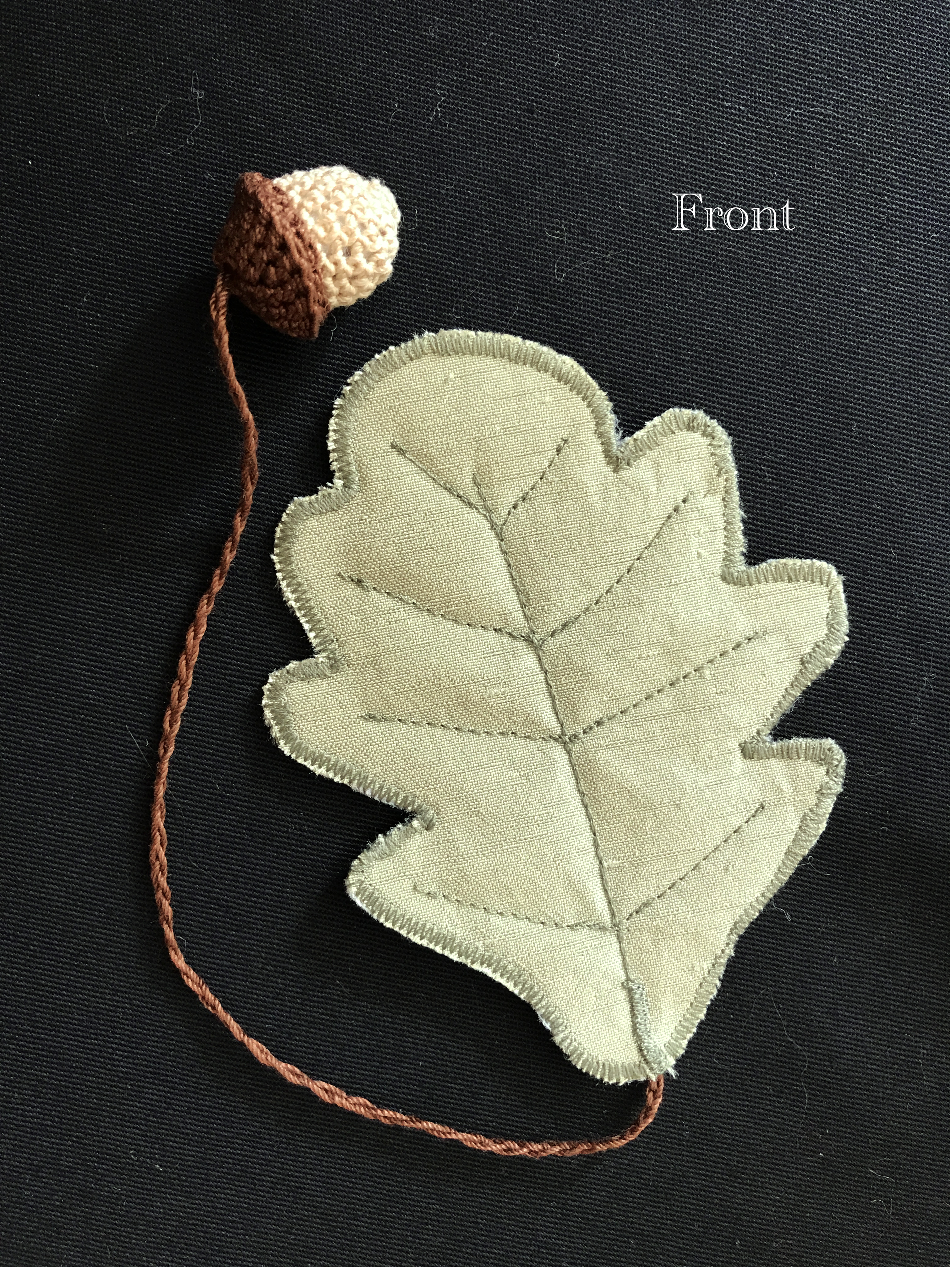 The acorns are made with lace crochet yarn, which makes the acorns themselves look lacy. They have been stuffed with the polyester batting that came from the offcuts of the oak leaves (which minimises waste) and are sewn to the leaves using the same yarn, which has been plaited to add sturdiness and texture.